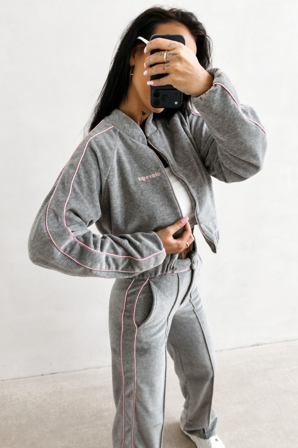 Rövidített fazon, végig futó cipzárral. A mandzsetták és a dzseki alja rugalmas passzéval záródik a tökéletes forma érdekében.Az ujjak mentén végigfutó kontrasztos lampaszok sportos karaktert adnak, az elején pedig diszkrét, hímzett OLAVOGA logó található.