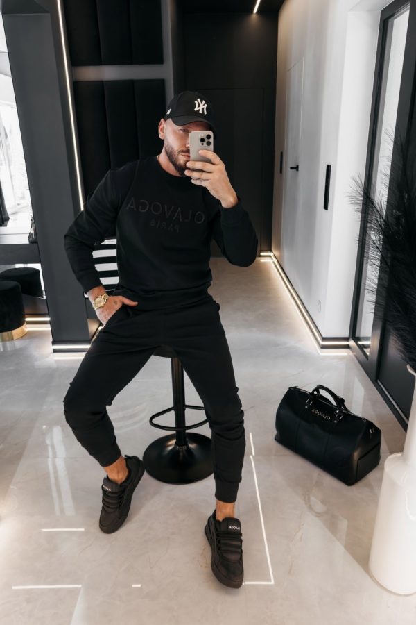 Felső (Pulóver): Klasszikus kerek nyakú fazon. Az ujjak és a pulóver alja rugalmas passzéval végződik. A mellrészen egy látványos, dombornyomott (3D) „OLAVOGA PARIS” hímzés található.