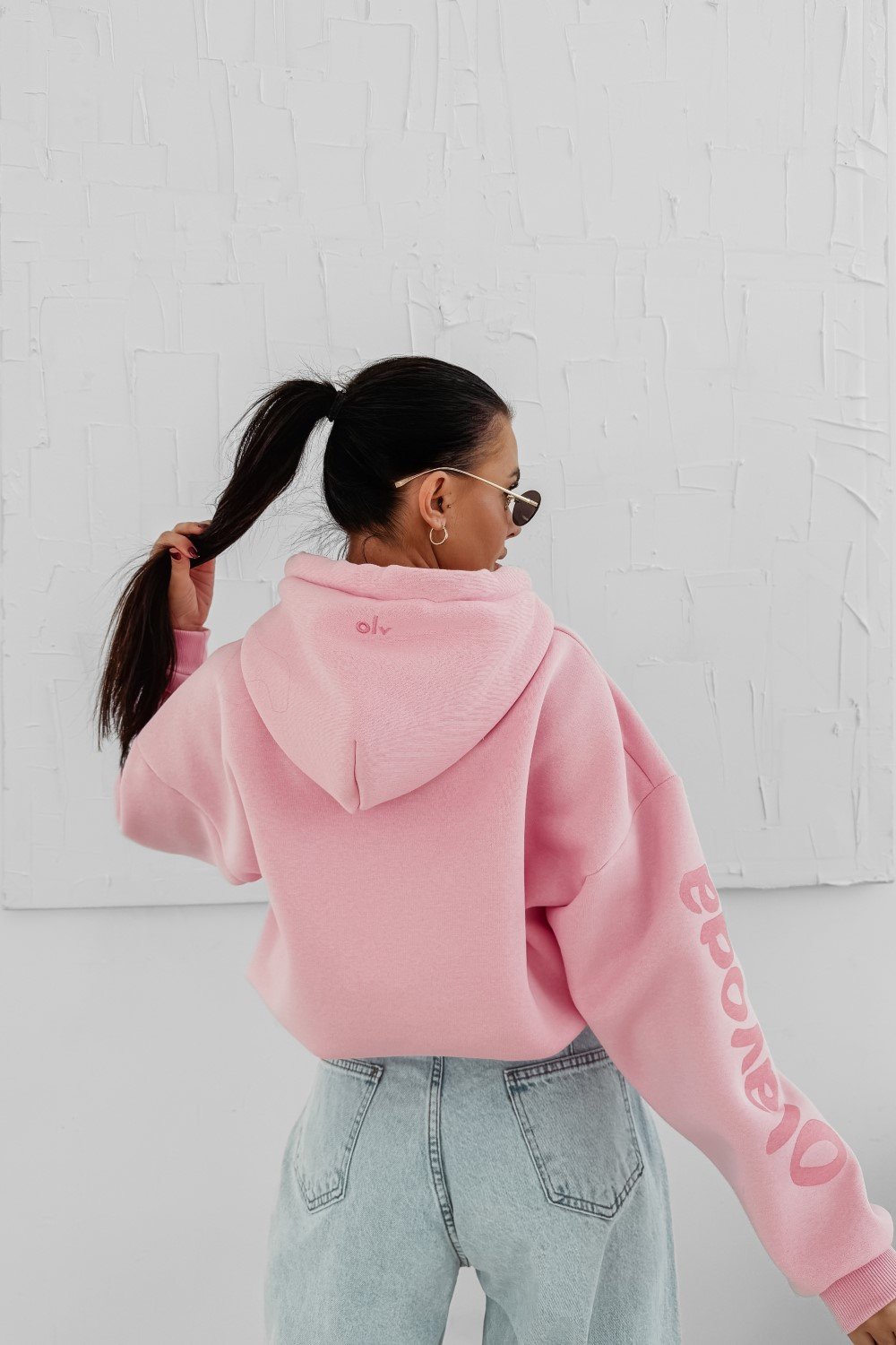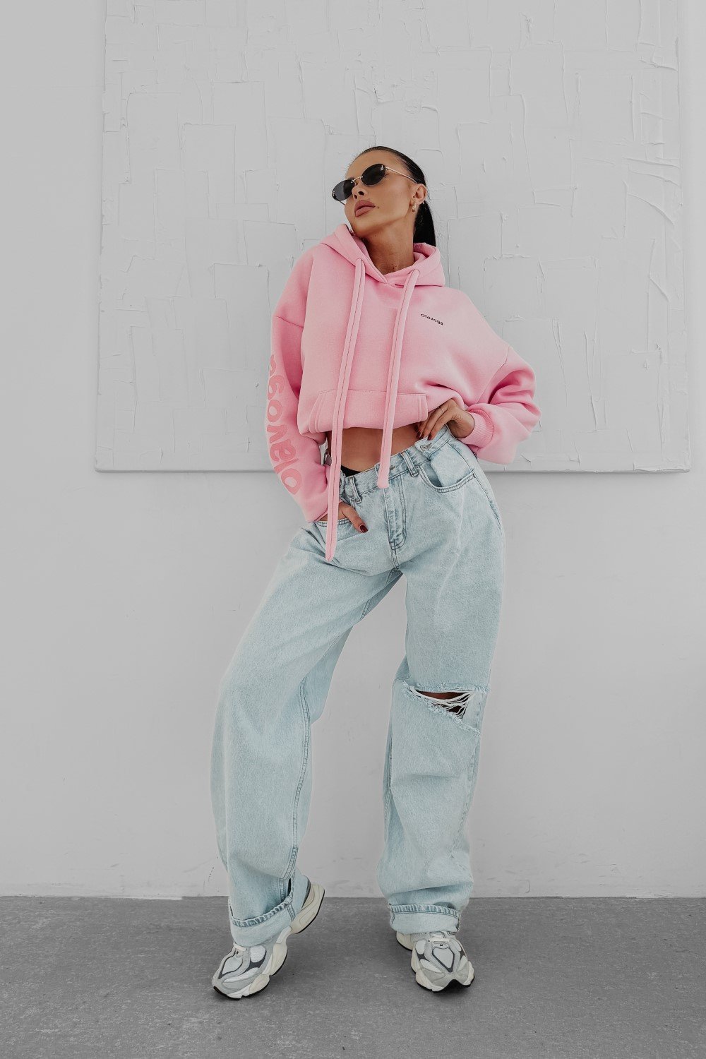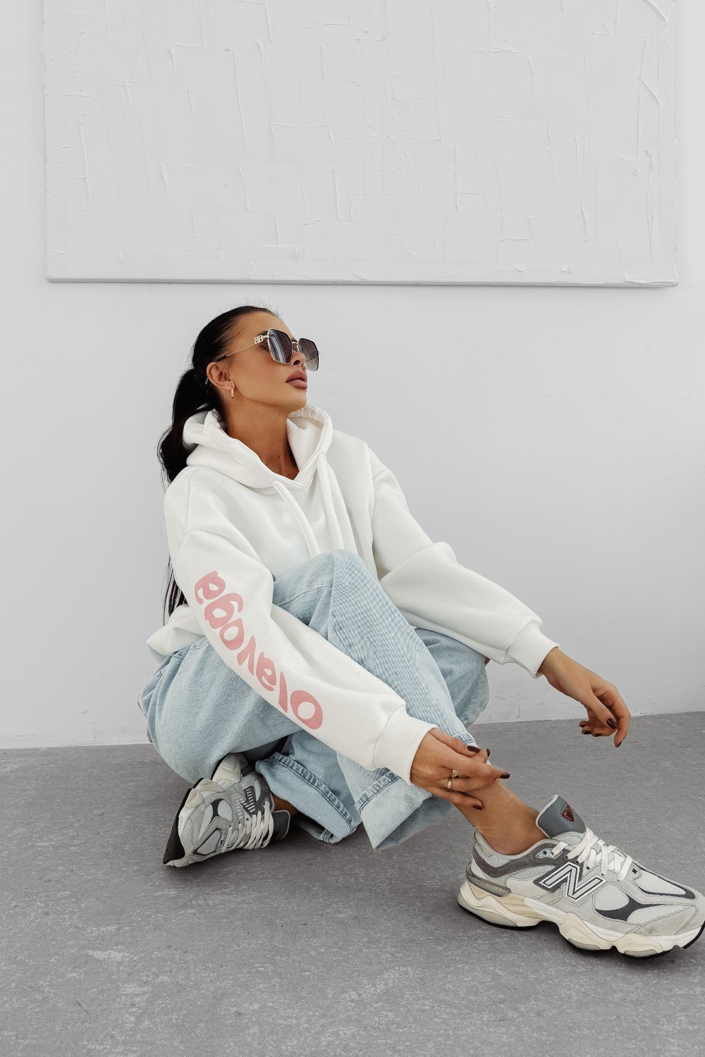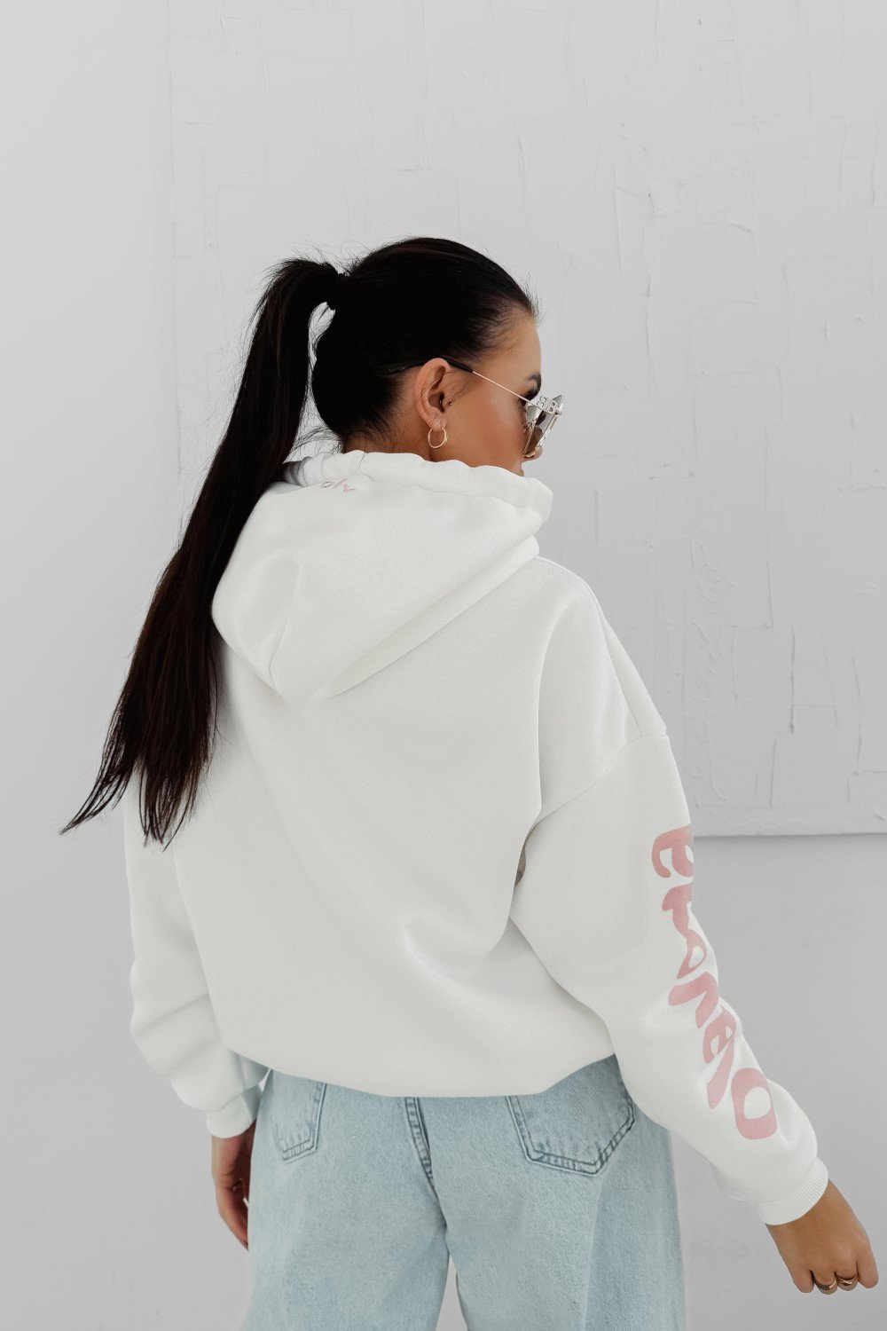 Oversize kapucnis pulóver hosszabb fazonnal. Különösen puha, komfortos anyagból, elöl nagy méretű kontrasztos logónyomattal.