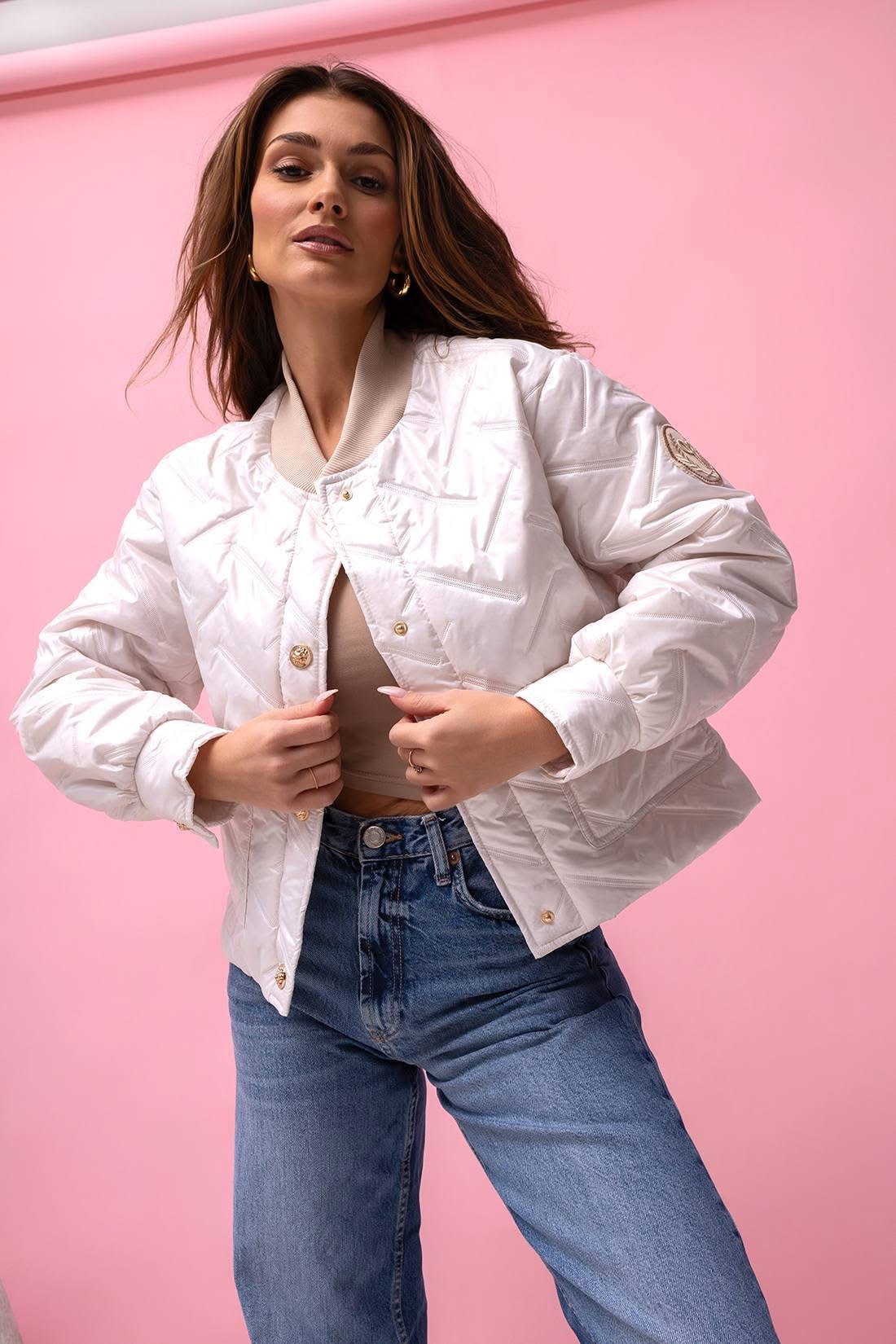 Könnyű, mégis látványos steppelt bomber dzseki, amely feldobja az egyszerű szetteket. Modern szabása és fényes anyaga trendi megjelenést biztosít, miközben praktikus választás hűvösebb napokra.