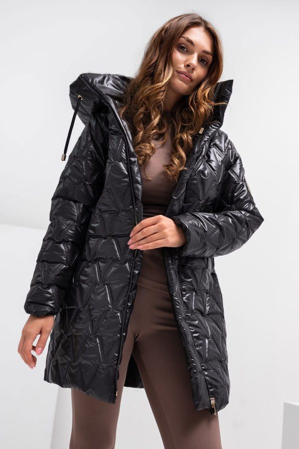 A steppelt mintázat és a fényes anyag luxus hatást kelt, miközben a kabát könnyű és kényelmes.